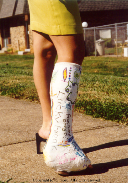 Julie Eisenhower with plaster walking cast incorporating toe plate and rubber walking heel. |